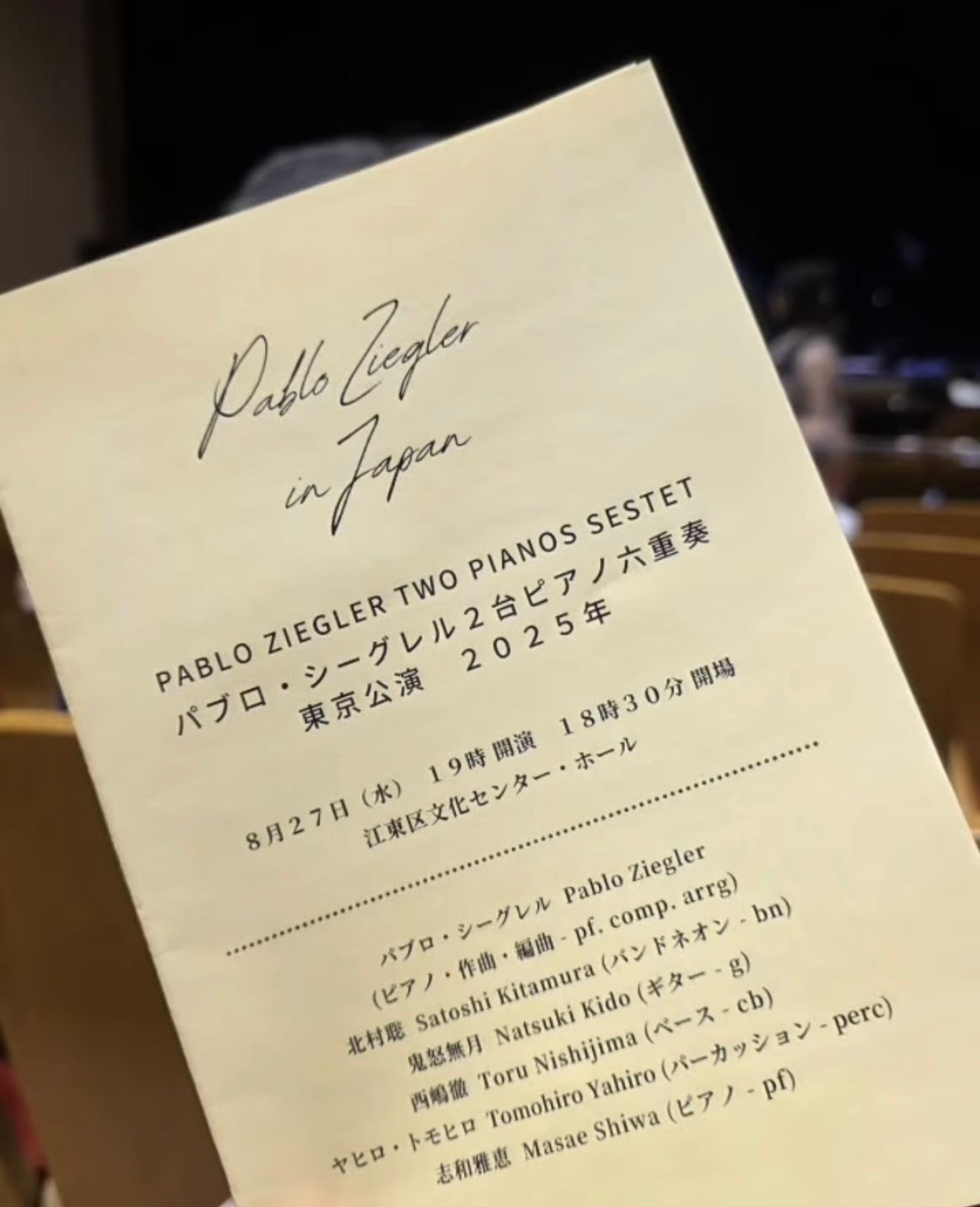 Lo acompañaron la pianista Masae Shiwa, Satoshi Kitamura (bandoneón), Natsuki Kido (guitarra), Toru Nishijima (bajo) y Tomohiro Yahiro (percusión), interpretando un repertorio que combinó obras propias de Ziegler y composiciones de Piazzolla.