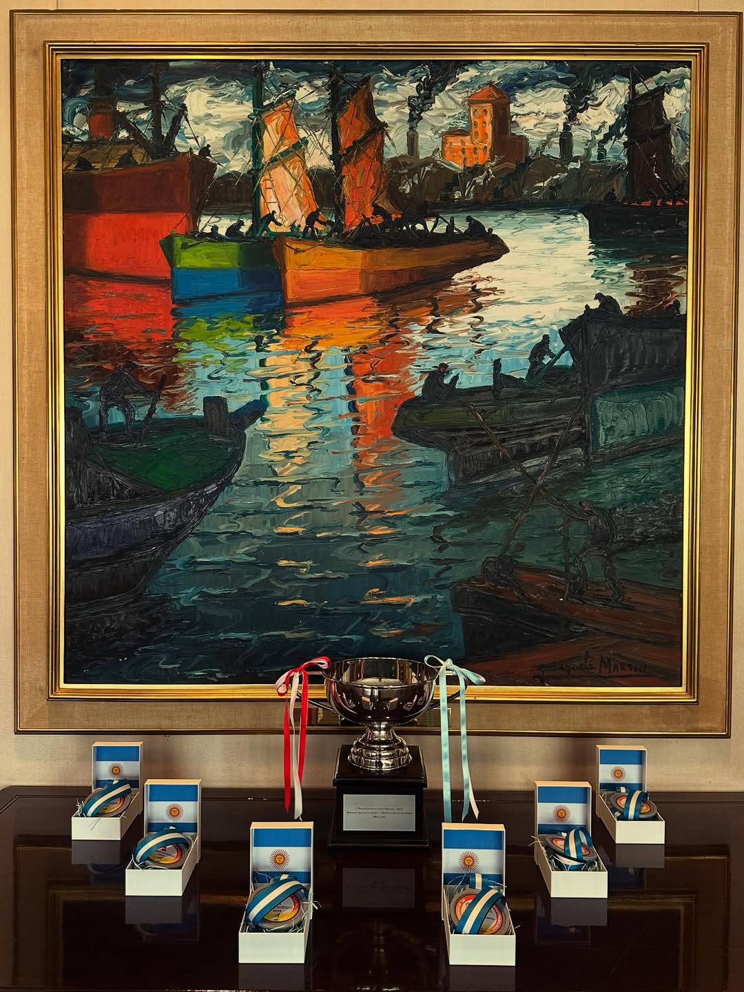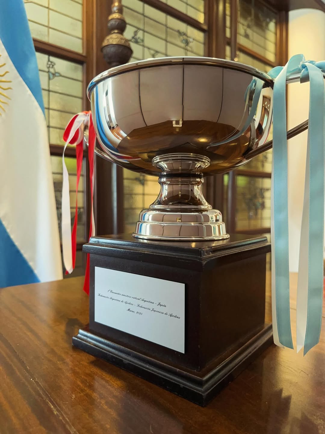 Entregamos al Presidente de la Federación Japonesa de Ajedrez, Hiroshi Manabe, la copa y medallas del 1er Encuentro amistoso de ajedrez Argentina-Japón