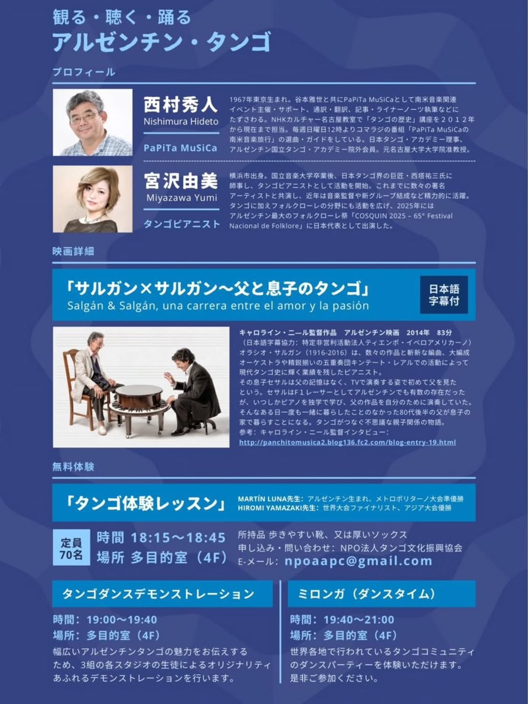 タンゴを五感で楽しむ特別な一日: 展示 ・ 映画上映 ・ コンサート ・ タンゴ・レッスン ・ タンゴデモ ミロンガ 日時:2025年11月14日(金)|13:00〜21:00 会場:赤坂区民センター(東京都港区赤坂4-18-13) 参加無料・申し込み不要 (タンゴ・レッスンのみ要事前予約) 東京の中心で、タンゴの魅力を体感しましょう!